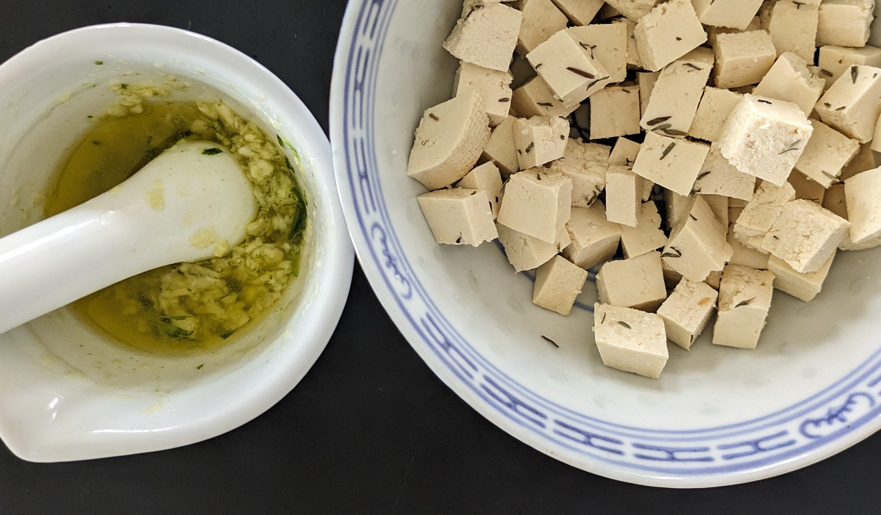 Tofu mariné en cubes, puis poêlé, à ajouter dans :